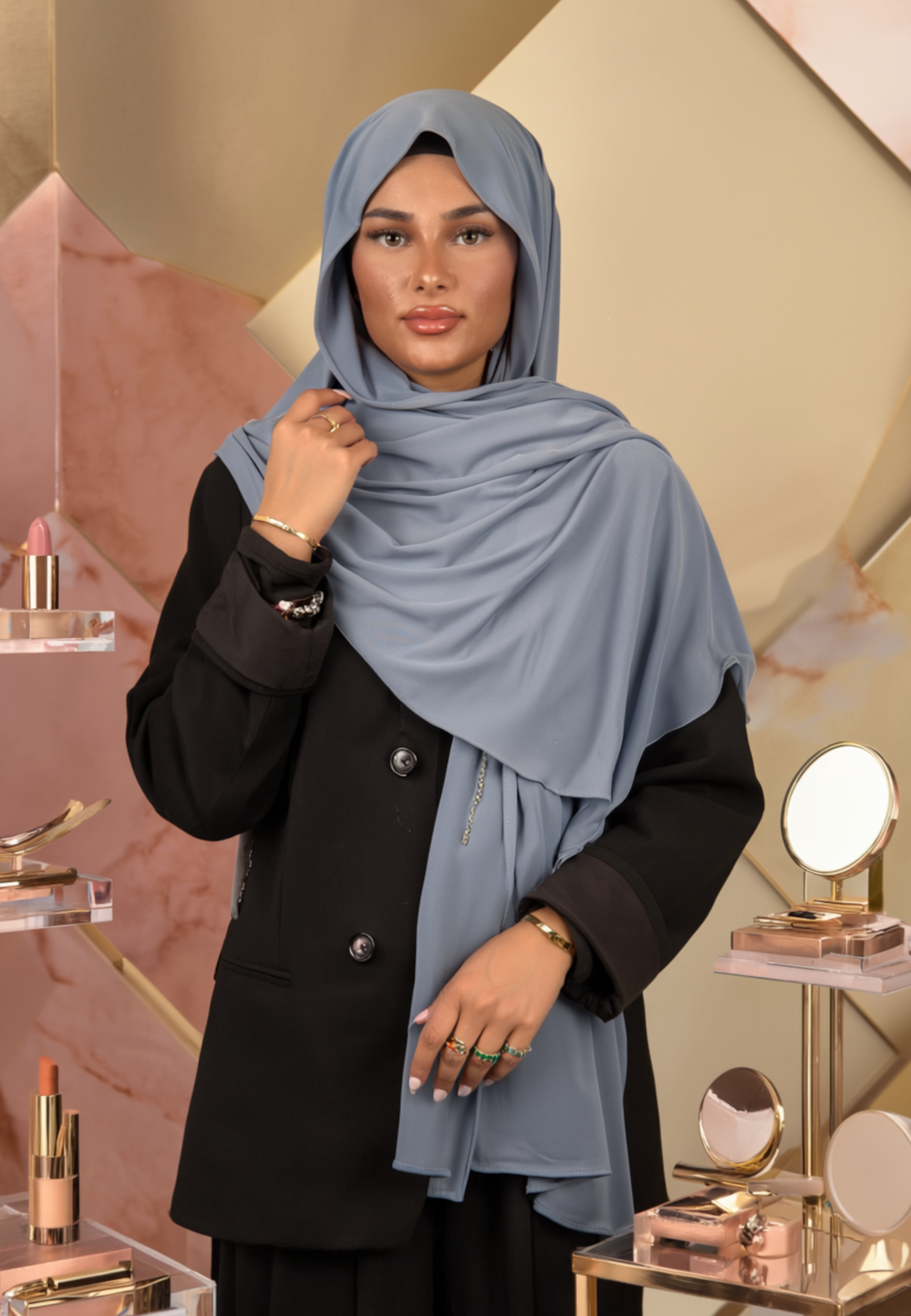 Die meisten unserer Hijabs haben Standardmaße von ca. 180 × 70 cm, perfekt geeignet für verschiedene Stylingtechniken – ob klassisch, turban-style oder locker getragen.